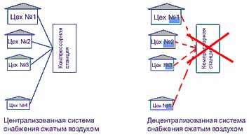 Существует два основных типа схем снабжения сжатым воздухом. Это централизованная и децентрализованная схемы. Схематично они изображены на рисунках (см.ниже).